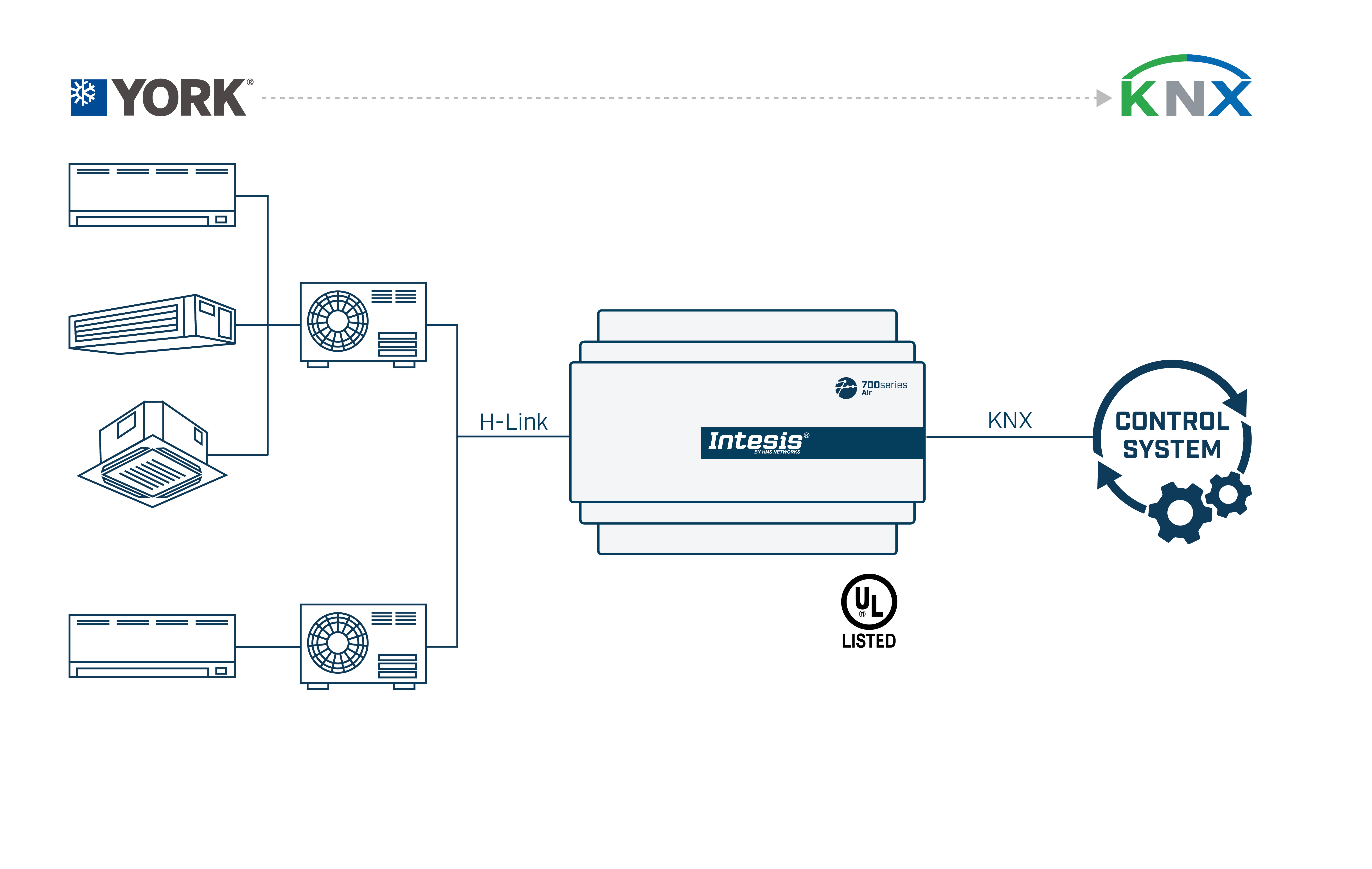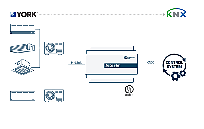 Die York-Anwendung ermöglicht die bidirektionale Steuerung und Überwachung von York VRF-Systemen von einer KNX-Installation aus. Diese Lösung ermöglicht die Integration von bis zu 64 Inneneinheiten.