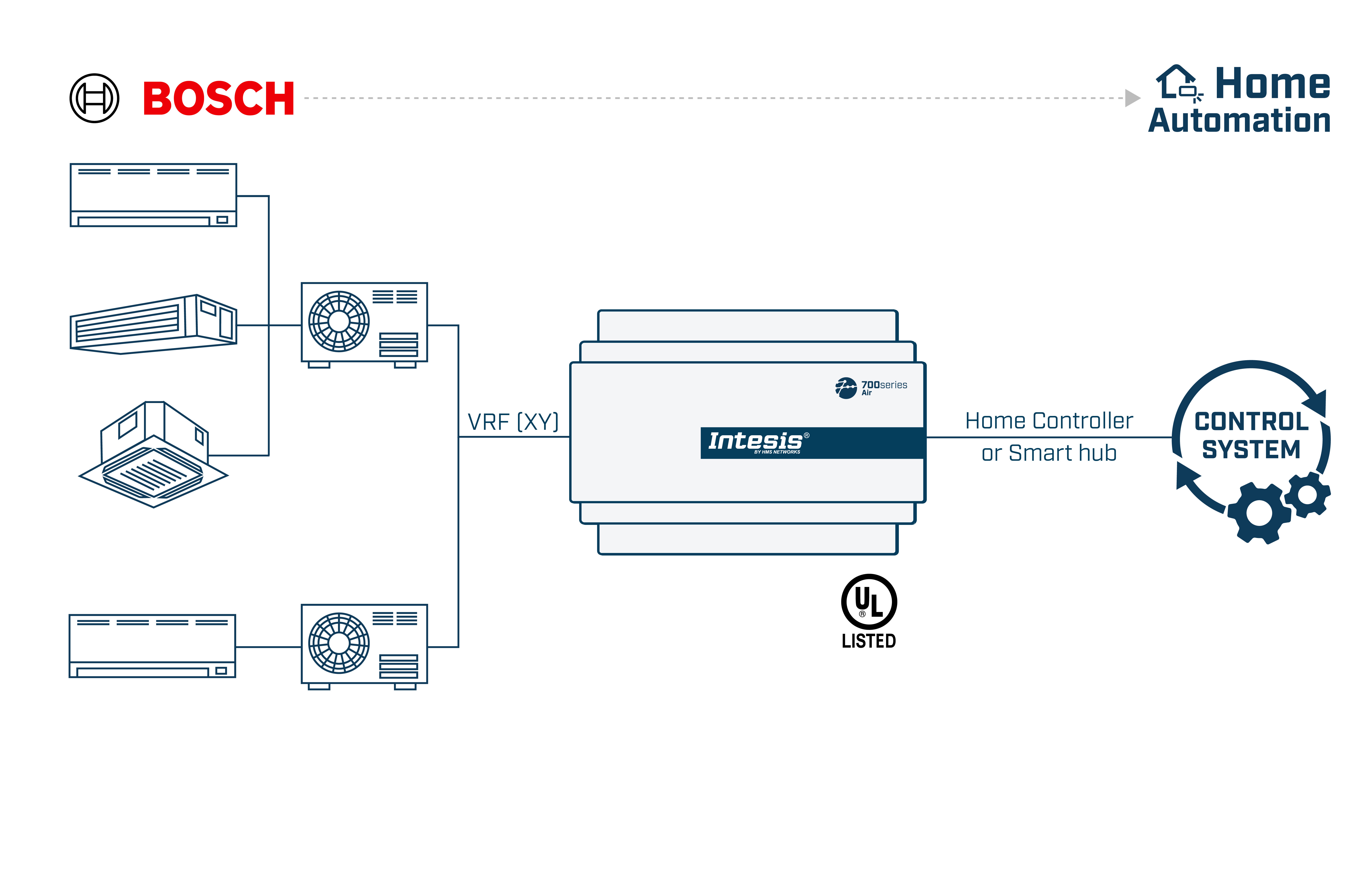 Die Bosch-Applikation wurde speziell entwickelt, um die bidirektionale Steuerung und Überwachung von Bosch Air Flux- und Mini-VRF-Systemen von einem Home Automation System aus zu ermöglichen. Die Lösung ermöglicht die Integration von bis zu 16 Innengeräten über eine einzige Schnittstelle.