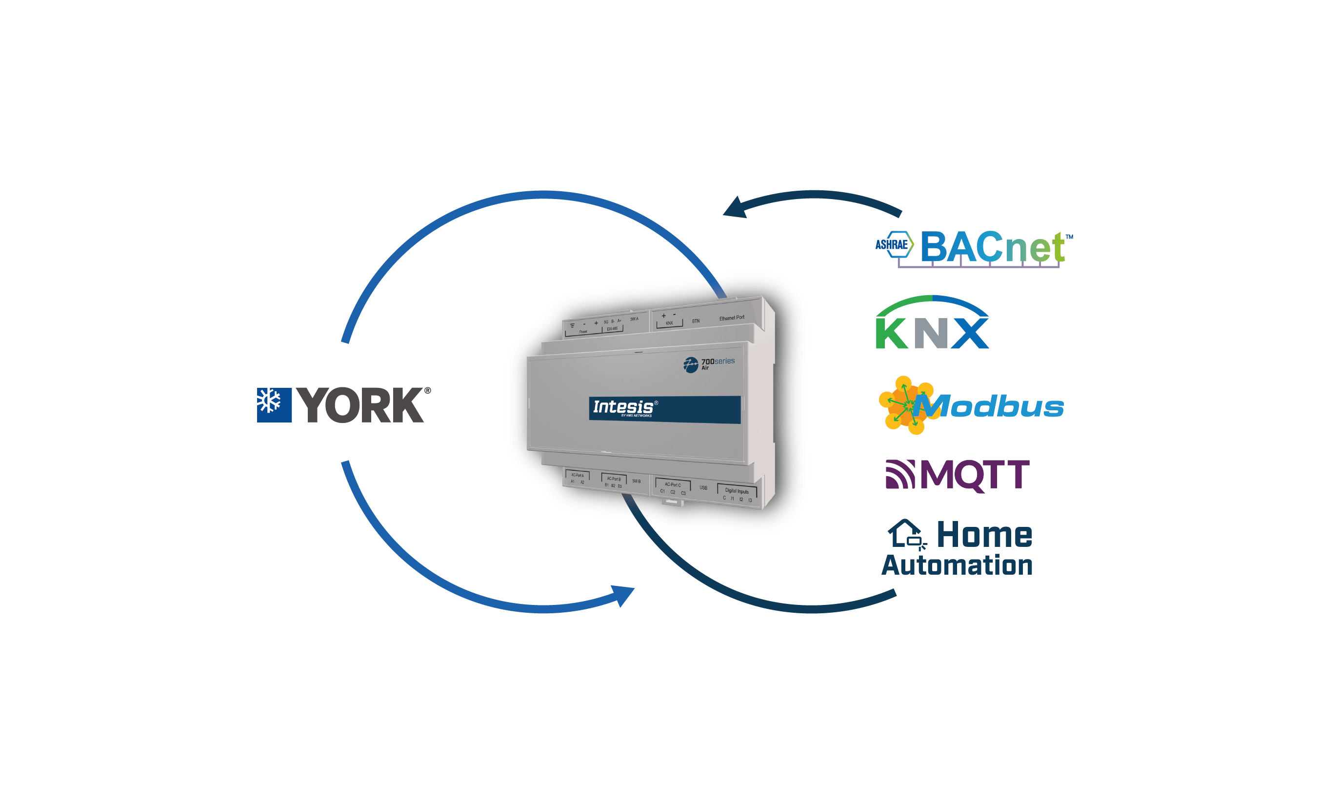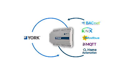 Die York-Anwendung ermöglicht die bidirektionale Steuerung und Überwachung von York VRF-Systemen von einem BMS, SCADA, SPS oder einer beliebigen Steuerung, die als BACnet/IP-Server oder BACnet MS/TP-Client arbeitet. Diese Lösung ermöglicht die Integration von bis zu 4 Innengeräten.