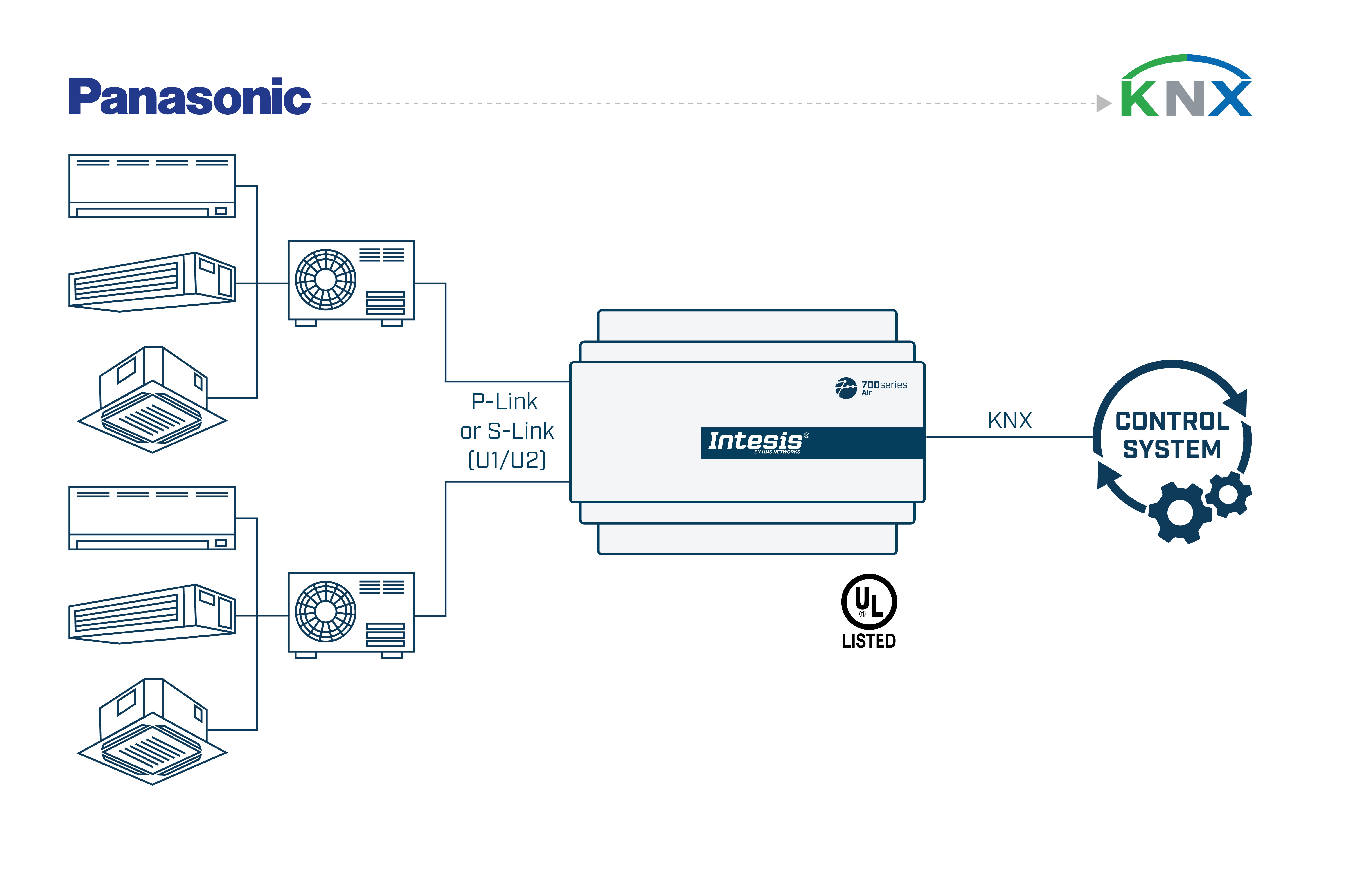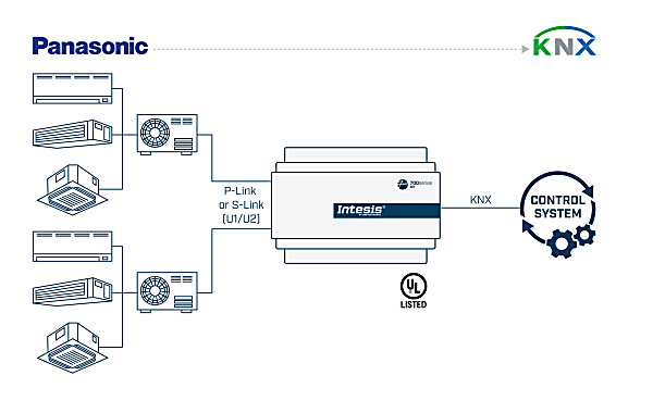 Die Panasonic-Applikation wurde speziell entwickelt, um die bidirektionale Steuerung und Überwachung von Panasonic ECOi-, PACi-, ECOg-/PAC- und VRF-Systemen von einer KNX-Installation aus zu ermöglichen. Die Lösung ermöglicht die Integration von bis zu 128 Innengeräten über eine einzige Schnittstelle.