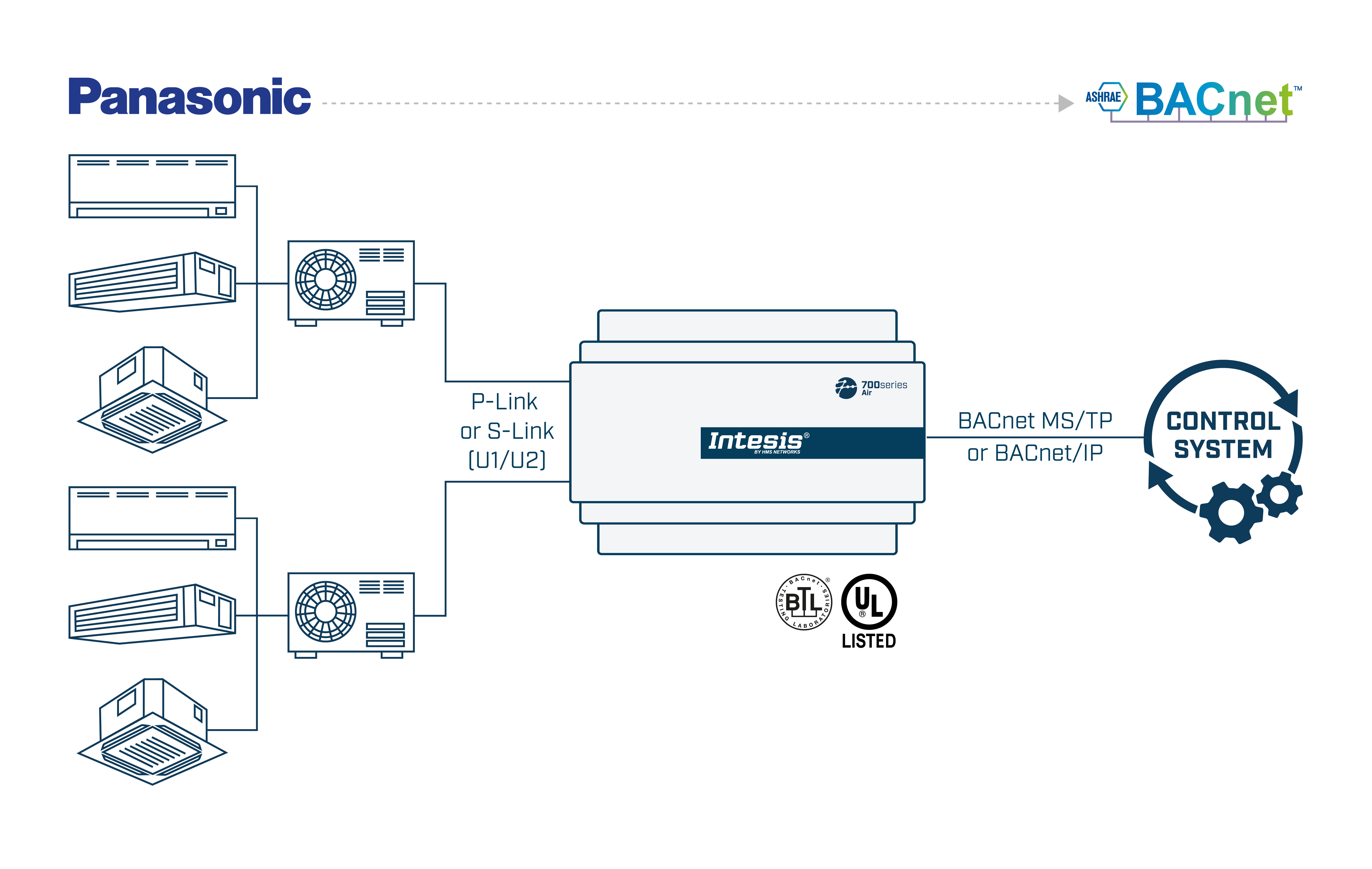 パナソニックのアプリケーションは、BMS、SCADA、PLC、またはBACnet / IPサーバーまたはBACnet MS / TPクライアントとして動作するその他のデバイスから、パナソニックECOi、PACi、ECOg / PAC、VRFシステムの双方向制御と監視を可能にするために特別に設計されています。 このソリューションでは、1つのインターフェースから最大128台の室内機を統合できます。
