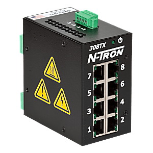 The 308TX Unmanaged Industrial Ethernet Switch is a robust 8-port 10/100BaseTX switch designed for harsh environments, featuring a wide operating temperature range of -40°C to 70°C. For replacement options, please see the 108TX, 708TX, or NT-5008-000-0000.