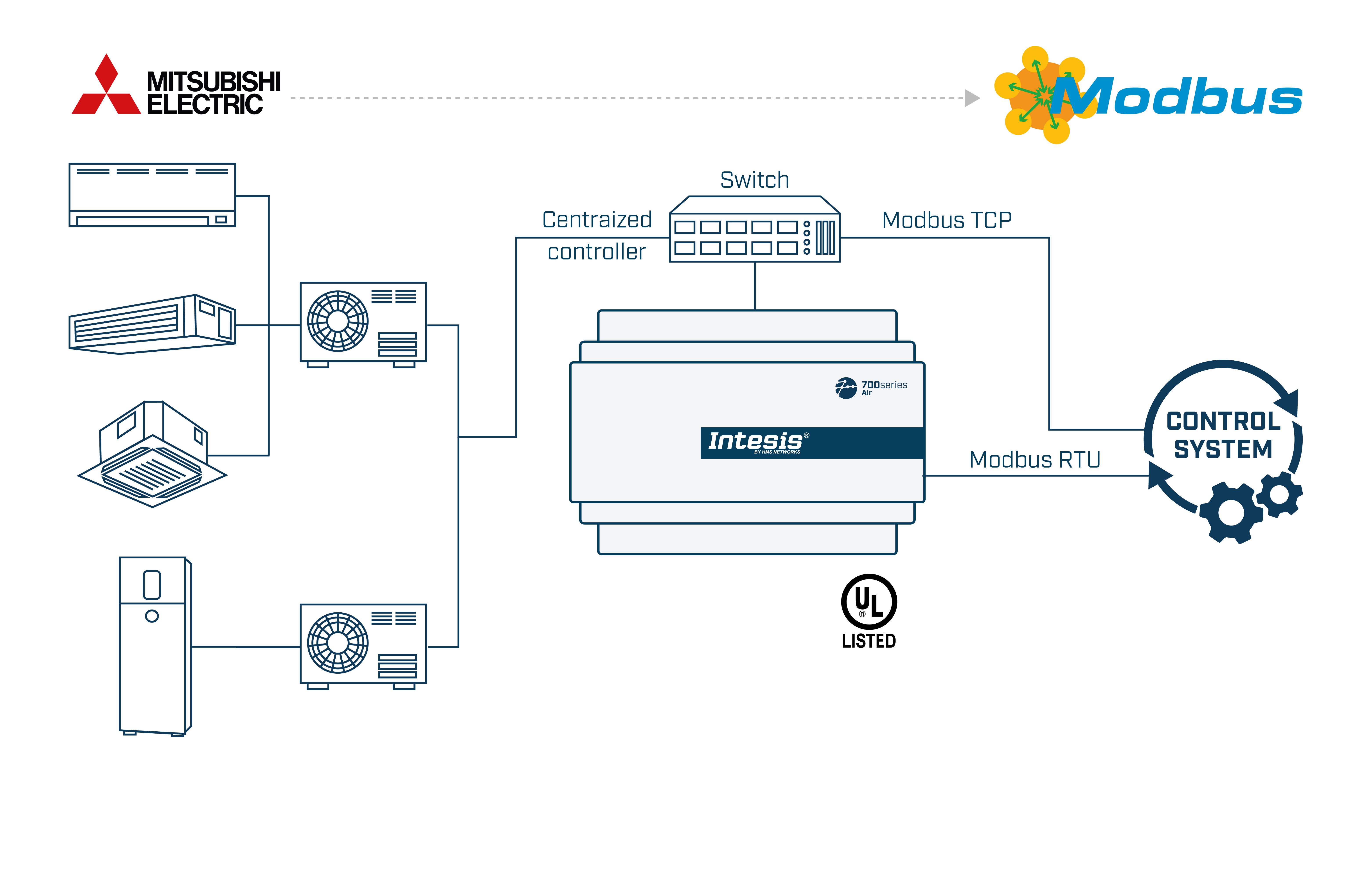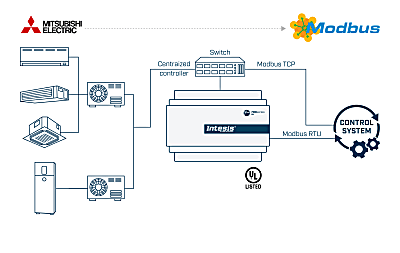 The Mitsubishi Electric application has been specially designed to allow bidirectional control and monitoring of Mitsubishi Electric City Multi systems from a BMS, SCADA, PLC, or any other device working as a Modbus client. The solution allows the integration of up to 100 groups from a single interface.