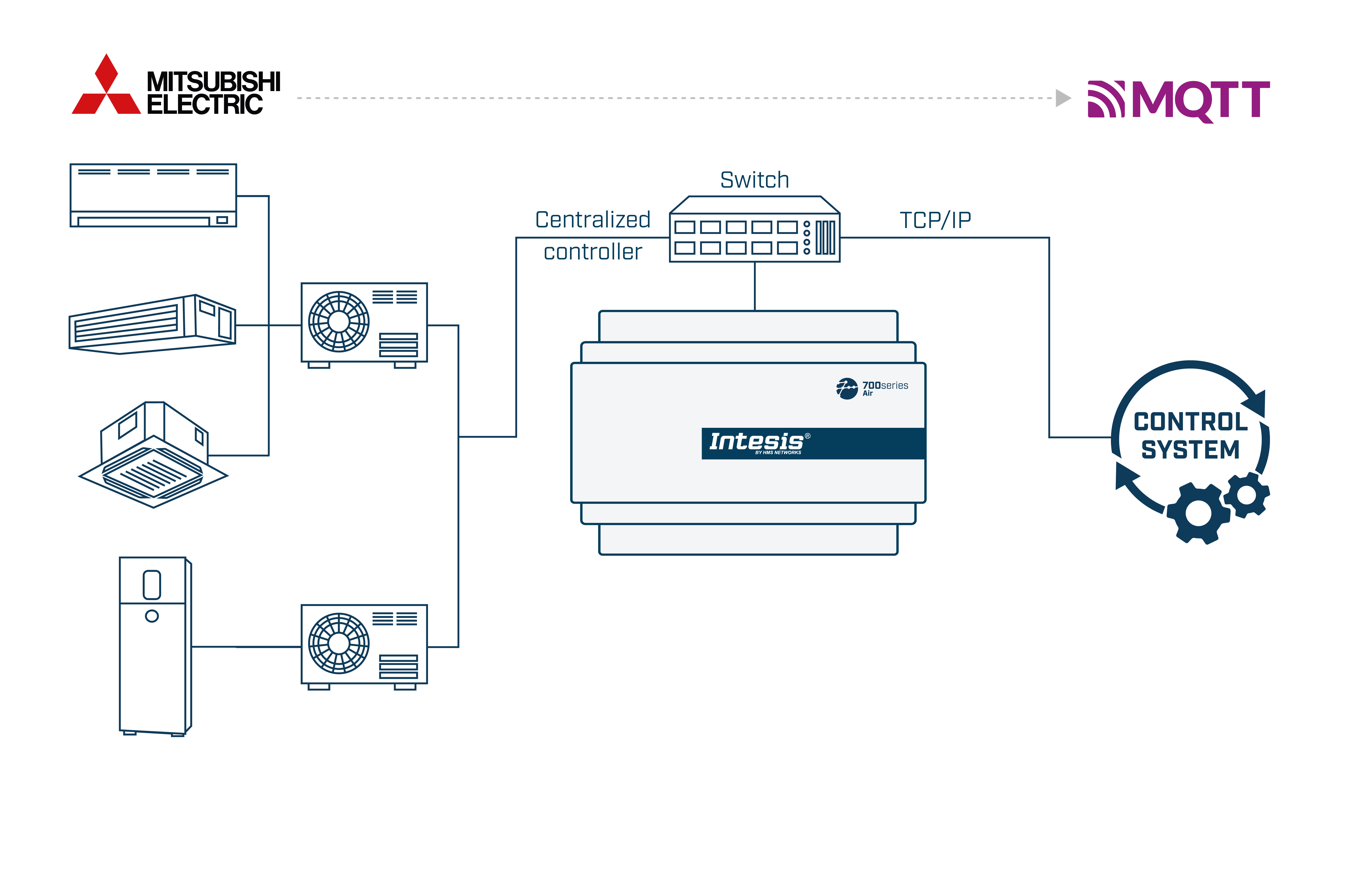 Connect Mitsubishi Electric multi-indoor unit systems to cloud and IoT platforms using MQTT, for real-time control, monitoring, and energy optimization. This solution allows the integration of up to 100 groups.