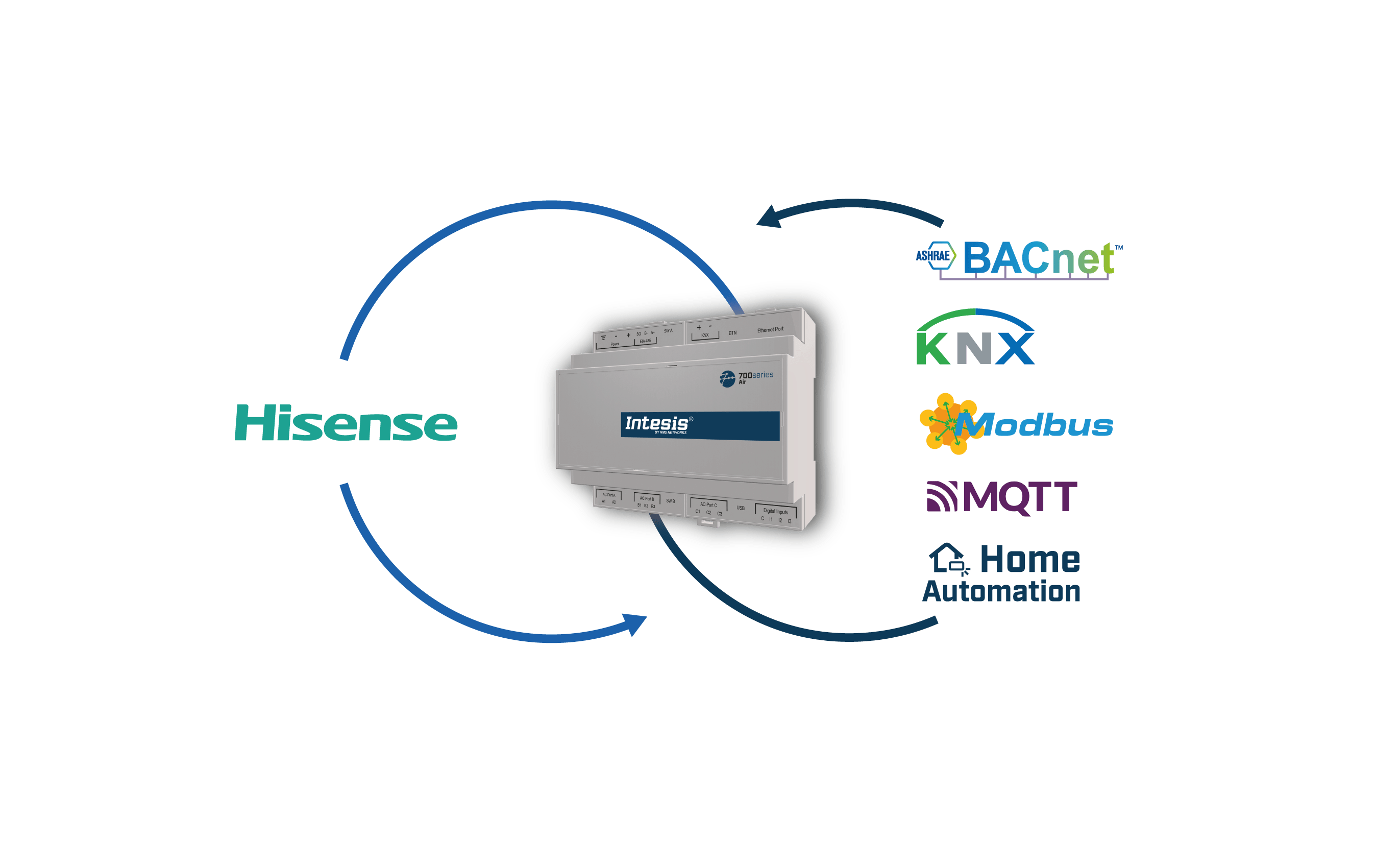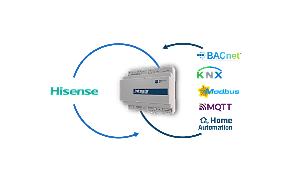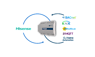 The Hisense application allows bidirectional control and monitoring of Hisense VRF systems from a BMS, SCADA, PLC, or any controller working as a BACnet/IP server or a BACnet MS/TP client. This solution allows the integration of up to 16 indoor units.