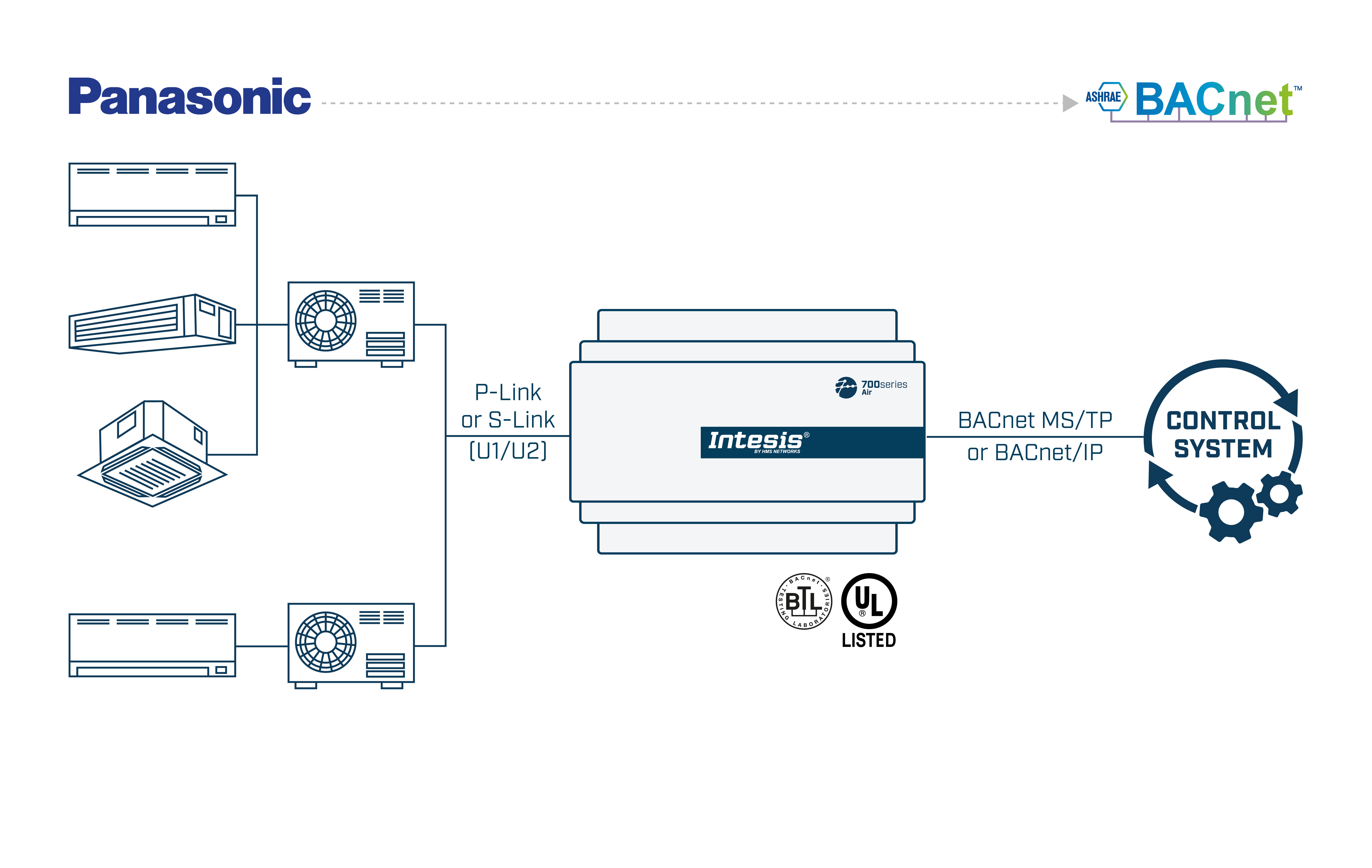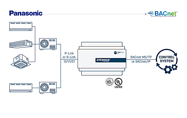 The Panasonic application has been specially designed to allow bidirectional control and monitoring of Panasonic ECOi, PACi, ECOg / PAC, VRF systems from a BMS, SCADA, PLC, or any other device working as a BACnet/IP server or a BACnet MS/TP client. The solution allows the integration of up to 16 indoor units from a single interface.