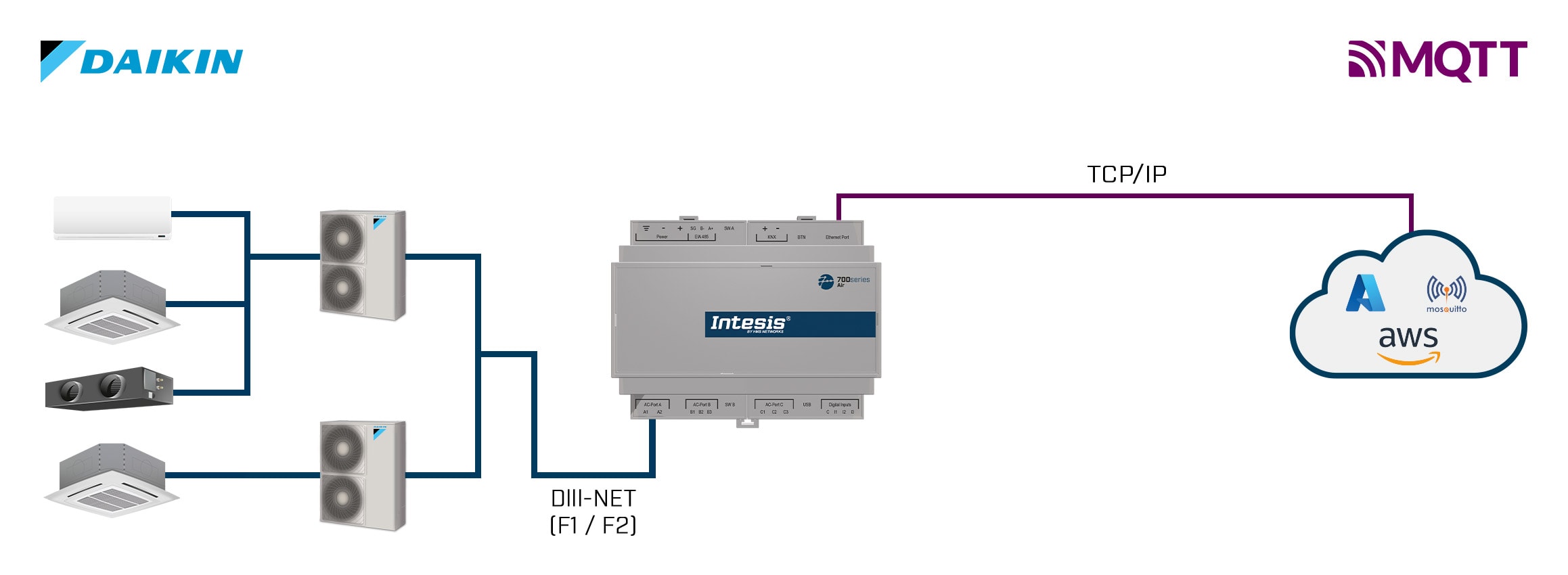 Connect Daikin multi-indoor unit systems to cloud and IoT platforms using MQTT, for real-time control, monitoring, and energy optimization. This solution allows the integration of up to 16 indoor units.