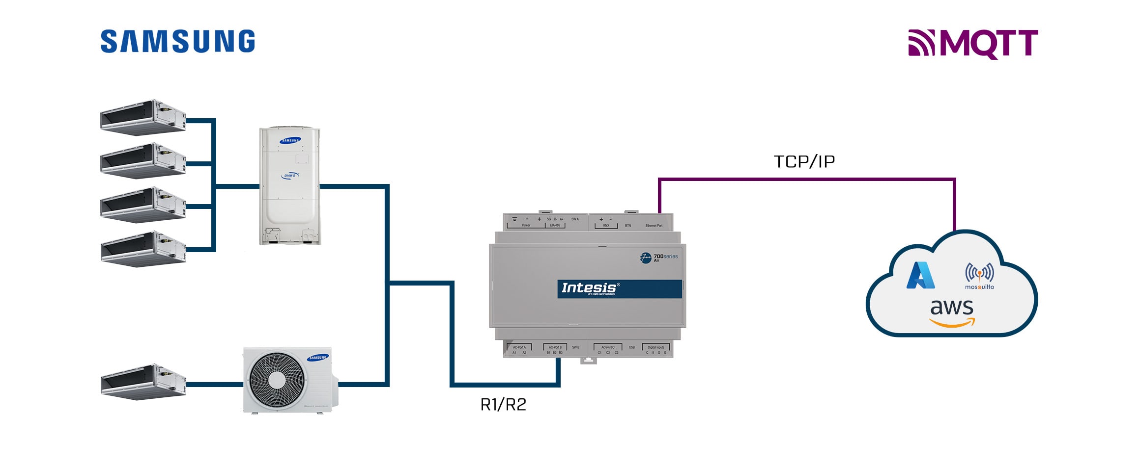 Connect Samsung multi-indoor unit systems to cloud and IoT platforms using MQTT, for real-time control, monitoring, and energy optimization. This solution allows the integration of up to 16 indoor units.