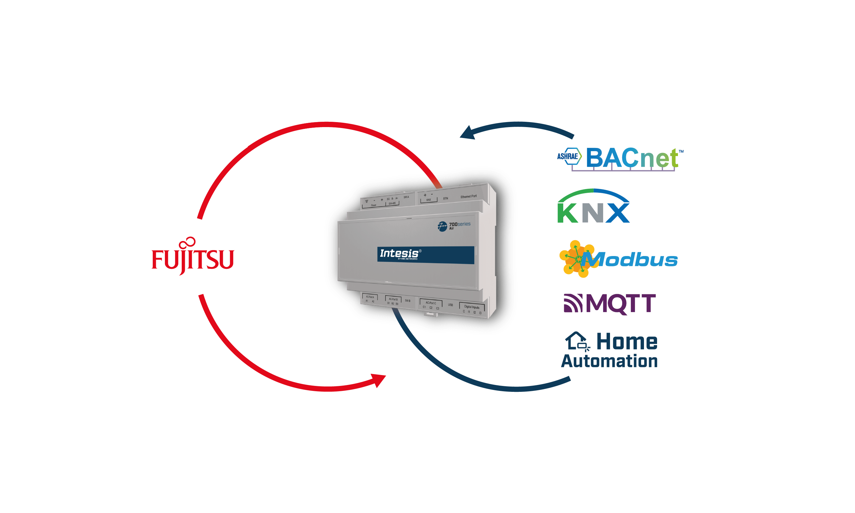 The Fujitsu application has been specially designed to allow bidirectional control and monitoring of Fujitsu VRF systems from a BMS, SCADA, PLC, or any other device working as a Modbus client. The solution allows the integration of up to 64 indoor units from a single interface.