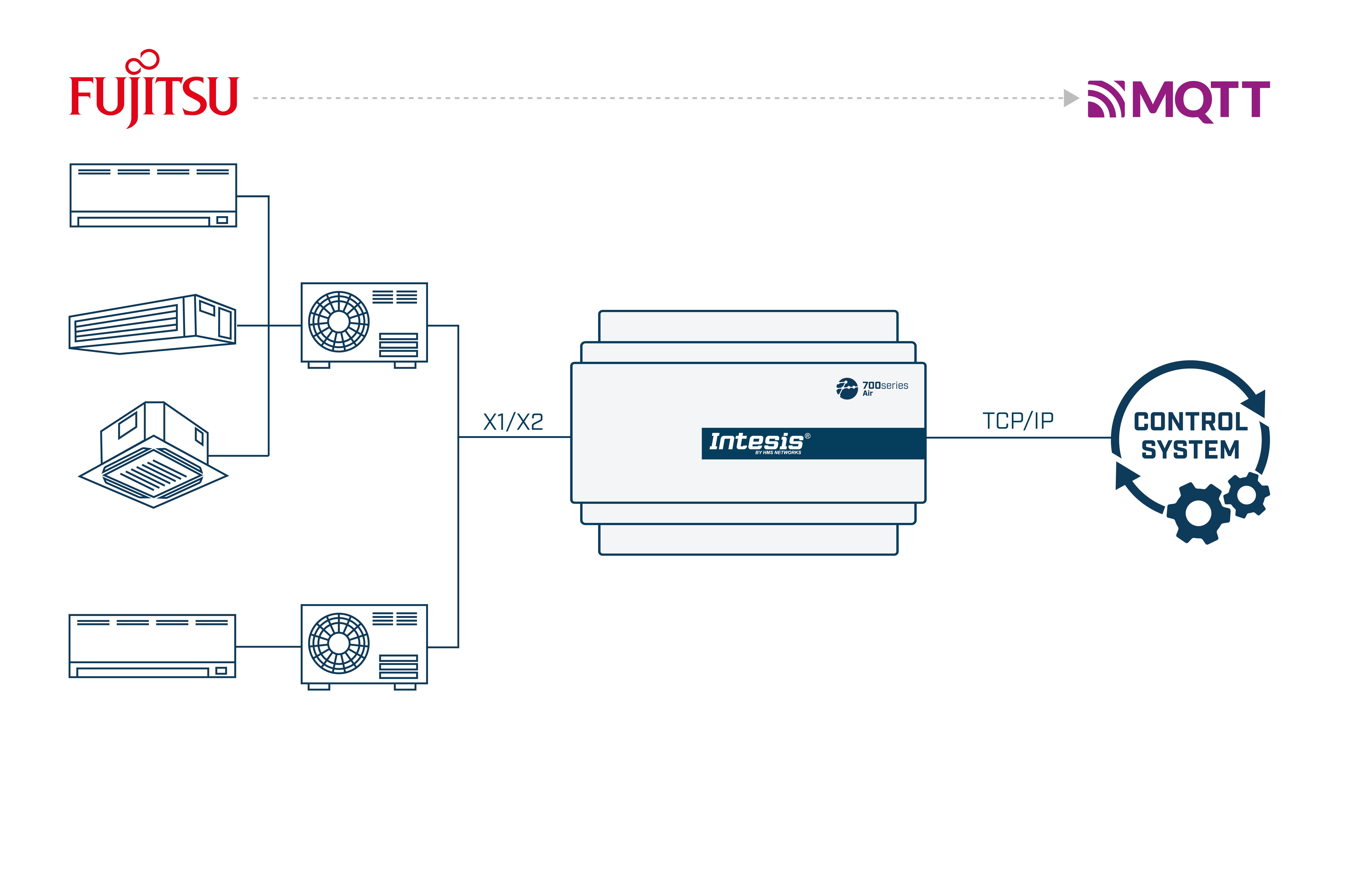 Connect Fujitsu General multi-indoor unit systems to cloud and IoT platforms using MQTT, for real-time control, monitoring, and energy optimization. This solution allows the integration of up to 64 indoor units.