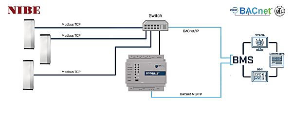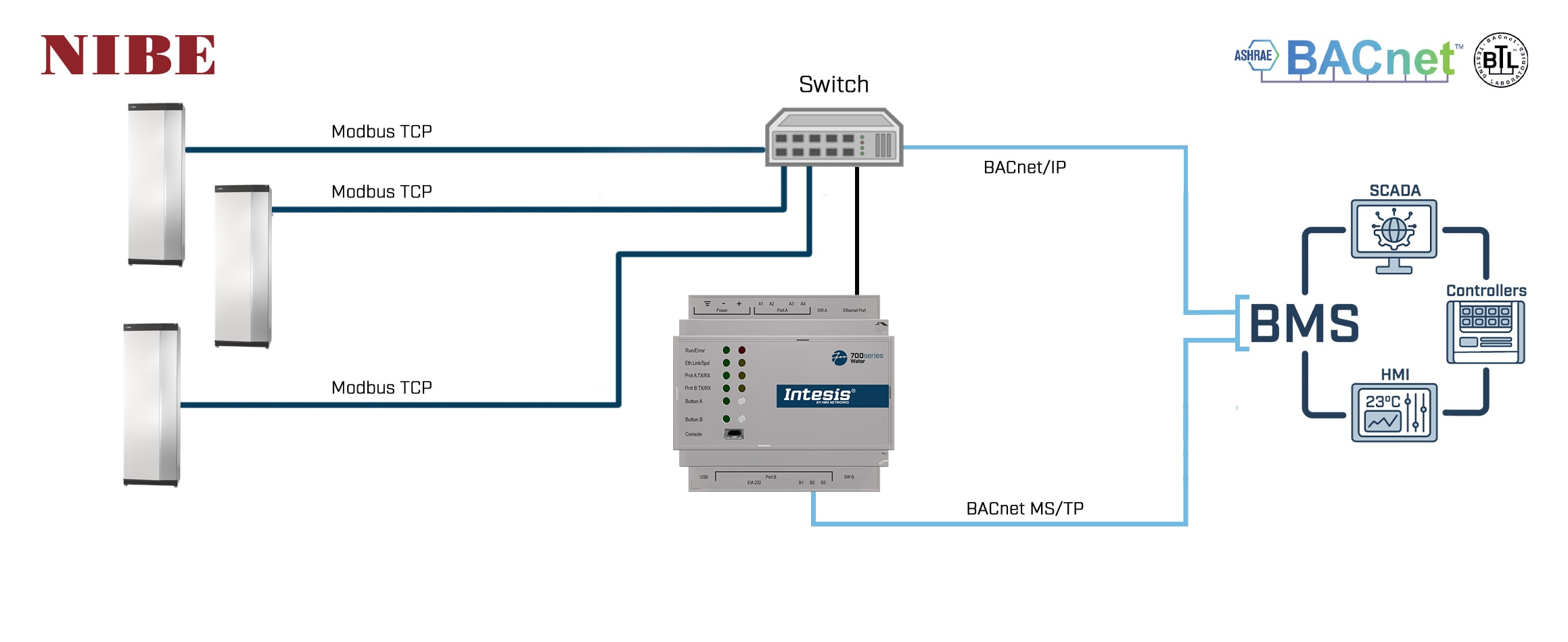 This gateway enables full monitoring and control of NIBE heat pumps from BACnet/IP and BACnet MS/TP building management systems.