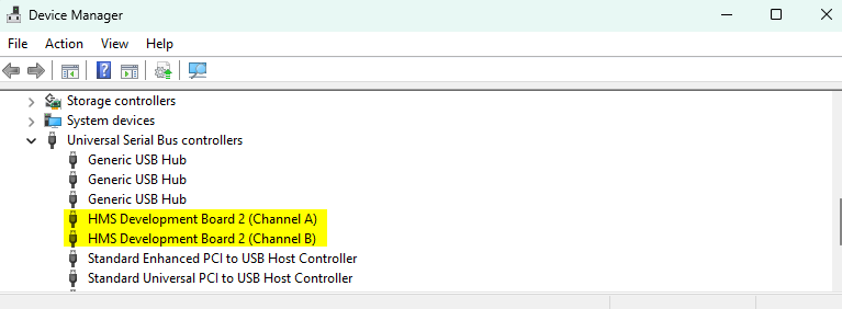 First, when you connect the development board to your computer, make sure it is correctly being detected in your system. For this, go to the Device Manager. When the board is correctly detected, you should see this under 'Universal Serial Bus controllers':