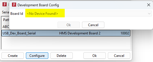 Once the board is correctly detected in your system, you should make sure that you have NOT initialized the module with the example application project provided, because the application will hog the Transport Provider to communicate with the Anybus CompactCom. That serial channel no longer being available for a firmware download, that error will be thrown when you try calling the Transport Provider again from Firmware Manager II.