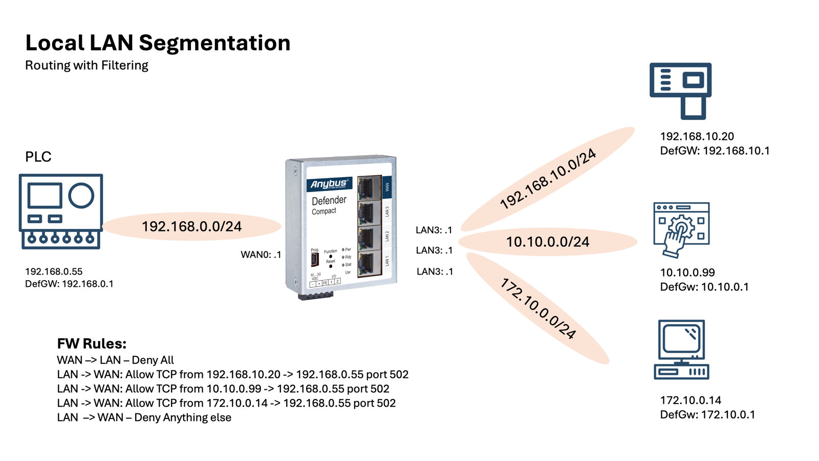 Configurations can be performed using the GUI (Anybus Defender Compact Manager software V1.2.8), including NAT, firewall rules, general settings, and logs. However, the available configuration options are limited depending on more advanced use cases. The Compact 1004 - NAT/FW has been further developed to support SSH. Through the CLI, the Compact 1004 - NAT/FW can be configured accordingly.