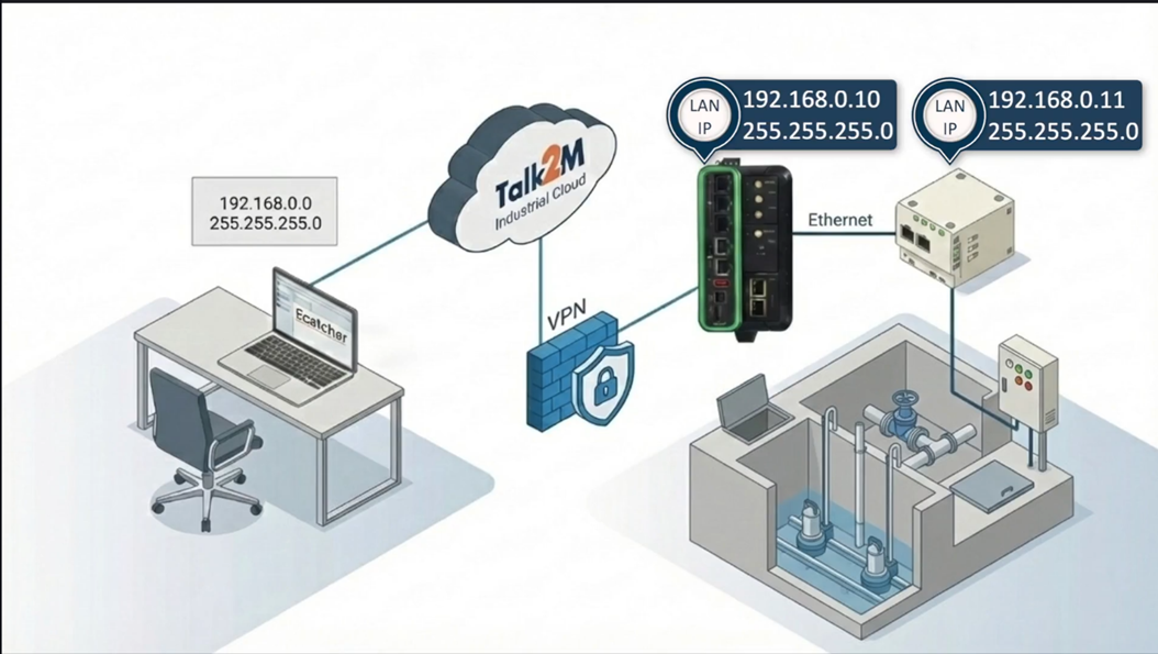 Talk2M uses routed VPN (Layer 3) architecture, requiring direct IP-based communication.