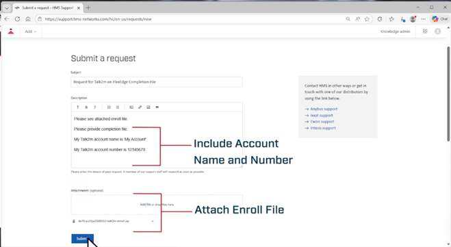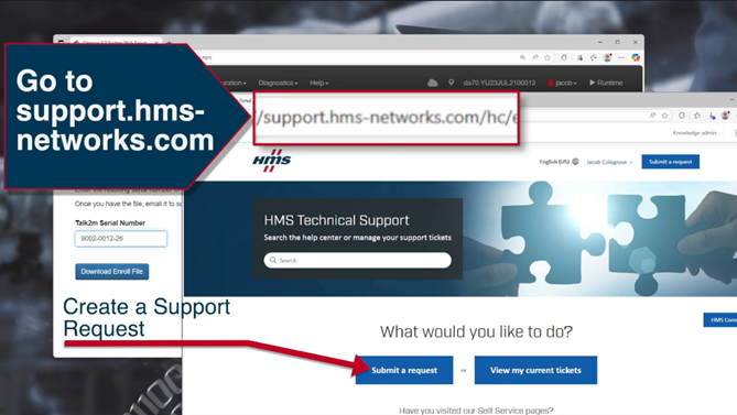 5. Go to support.hms-networks.com and submit a support request using Ewon as the product brand, and Talk2M as the product group.