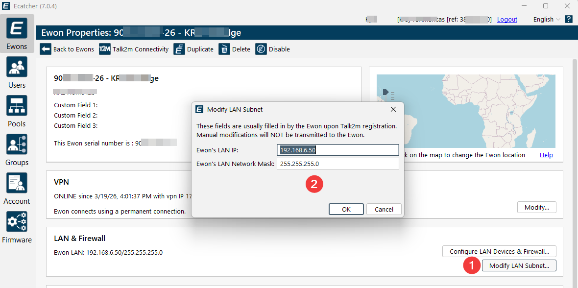 11. The FlexEdge should show as online in Ecatcher, as long as it has an internet connection, but there is one more setting to change. In Ecatcher, in the Ewon's Properties, navigate to 'LAN & Firewall' > 'Modify LAN Subnet". Here you will choose which network the VPN will bridge to on the FlexEdge.