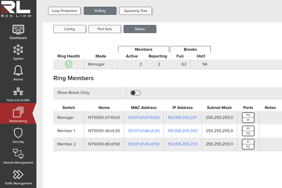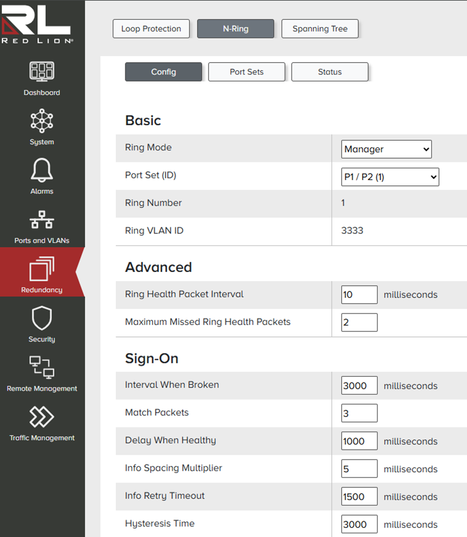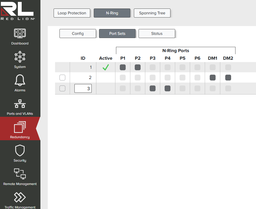 Navigate to Redundancy -> N-Ring -> Port Sets