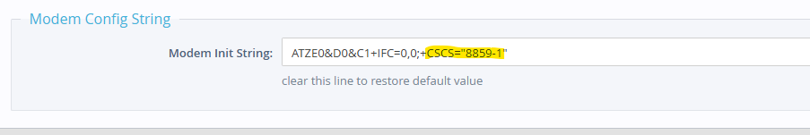 To switch the encoding mode in the Flexy, the value +CSCS="GSM" of the modem Init string must be switched to +CSCS="8859-1" :