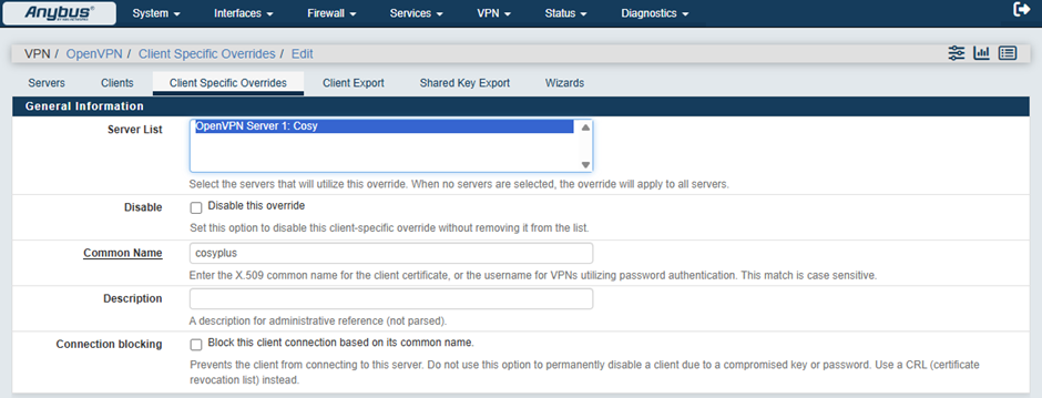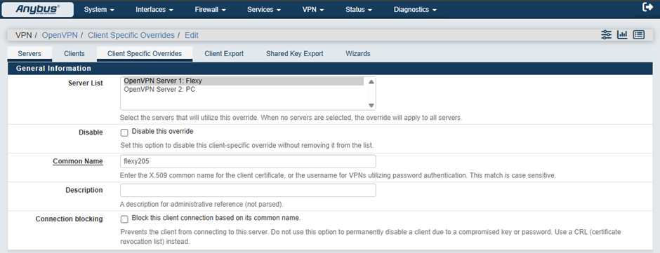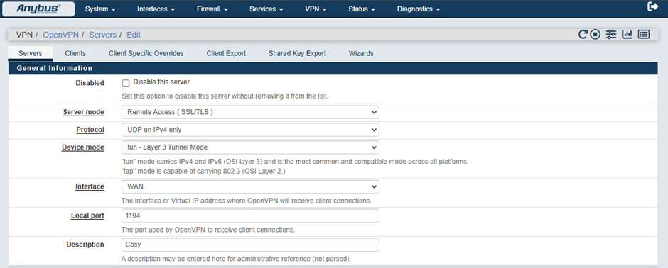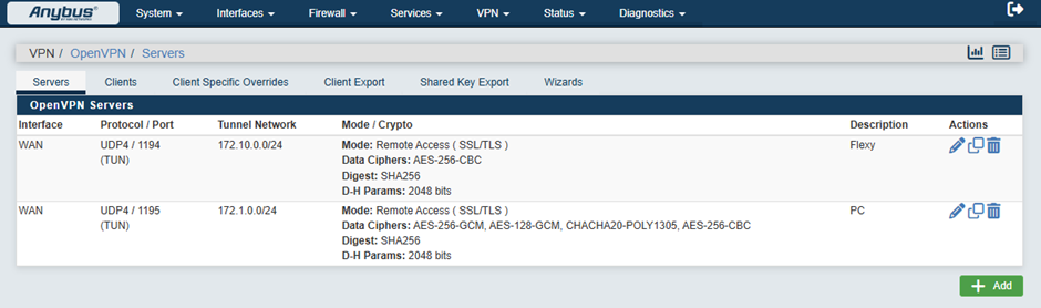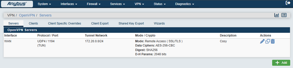 Follow this guide for Connecting Cosy/Flexy as VPN clients: https://support.hms-networks.com/hc/en-us/articles/26680200195986-How-to-configure-the-Anybus-Defender-as-VPN-Server-for-Ewon-Flexy-Cosy We call this VPN server "Flexy".