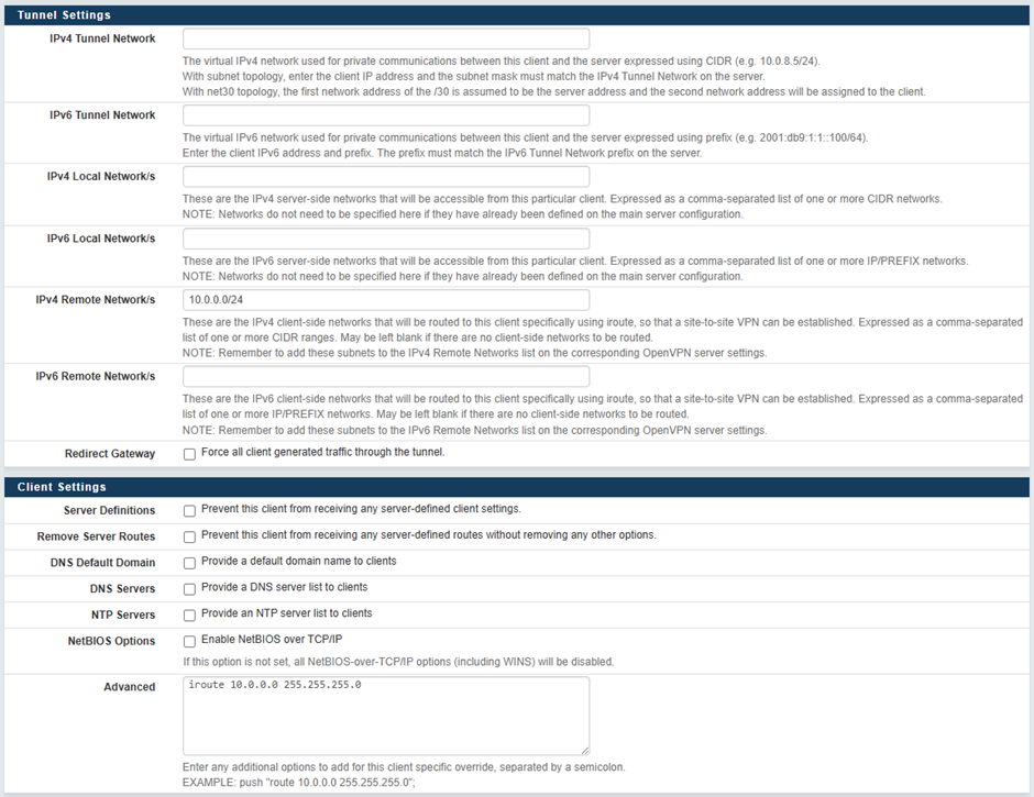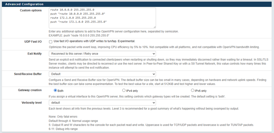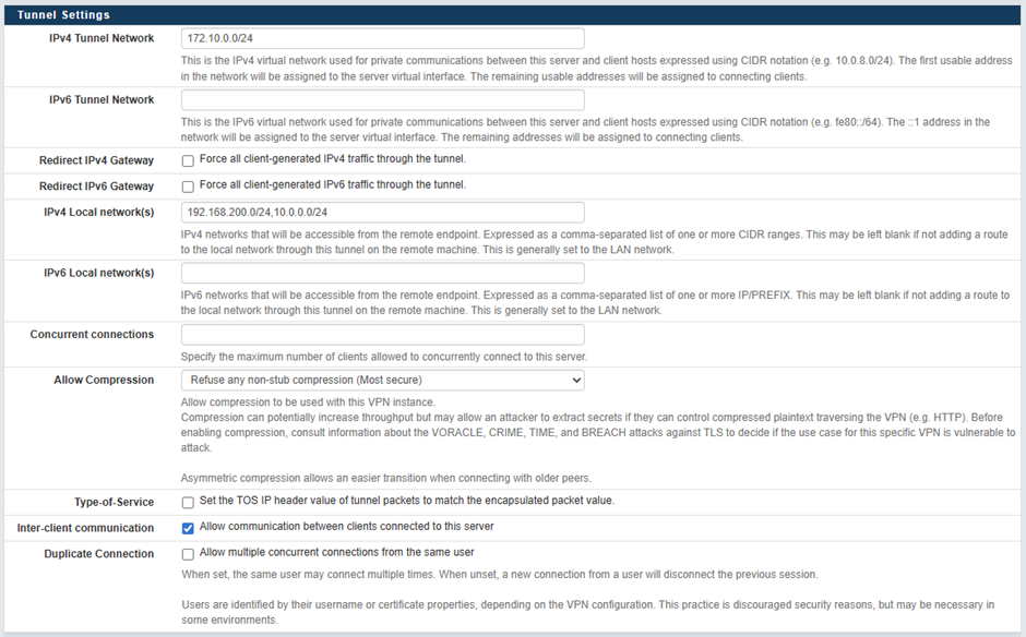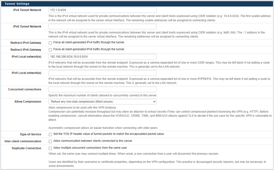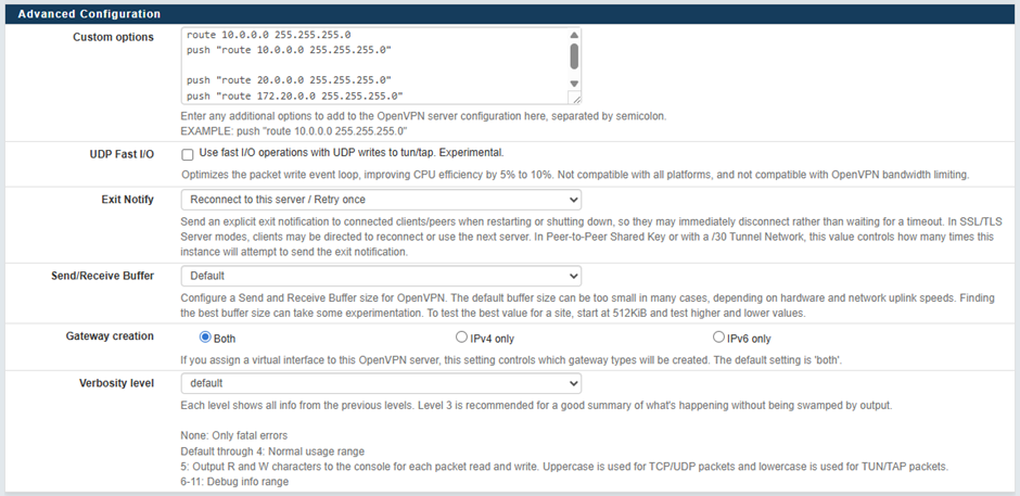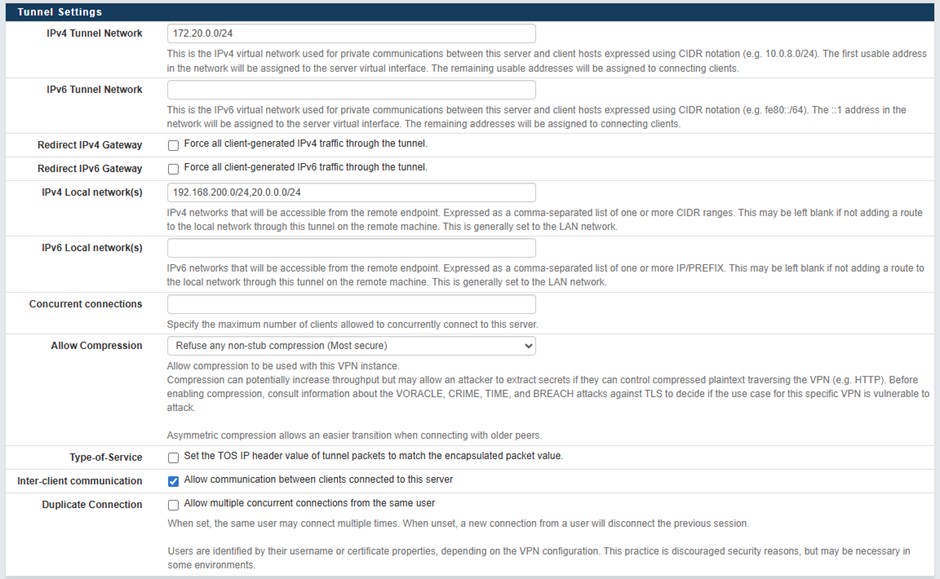 Choose a IPv4 Tunnel Network and write the local networks on the Defender tha you wan to announce to the VPN spokes so you can also allow Inter-client communication:Write what you see below in Custom options: