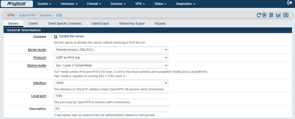 Follow this guide for setting up VPN for PC clients: https://support.hms-networks.com/hc/en-us/articles/32510760936978-How-to-Setup-an-OpenVPN-server-on-Anybus-Defender using the build in Wizard. We call this VPN server "PC".
