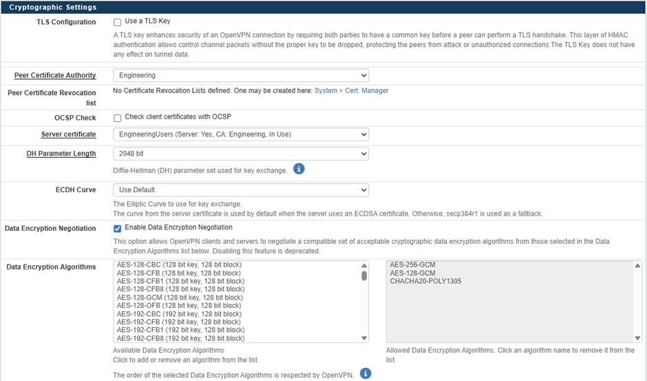 The following is the configuration for the VPN Server connecting Engineering Users. Using the wizard will bring a good default configuration, verify with below steps: