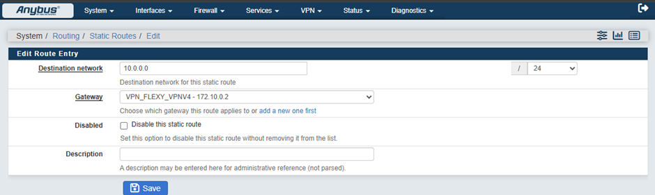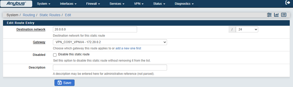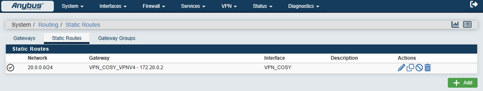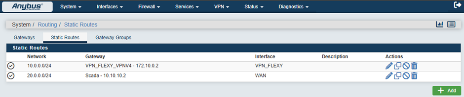 We create two routes, one for each Flexy/Cosy LAN network. The first one for the device connected to the server on the same Defender as the Engineering user and the second for the device on the other Defender.