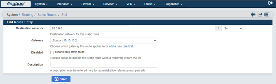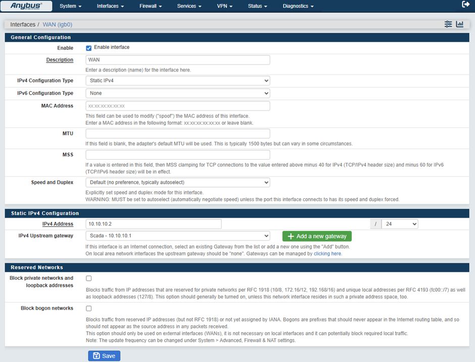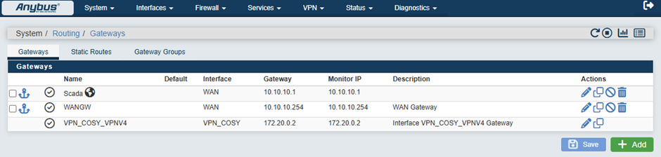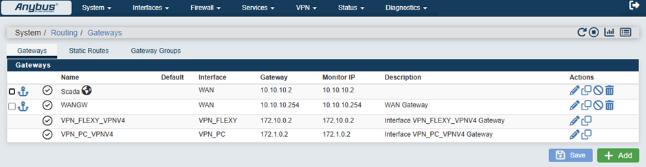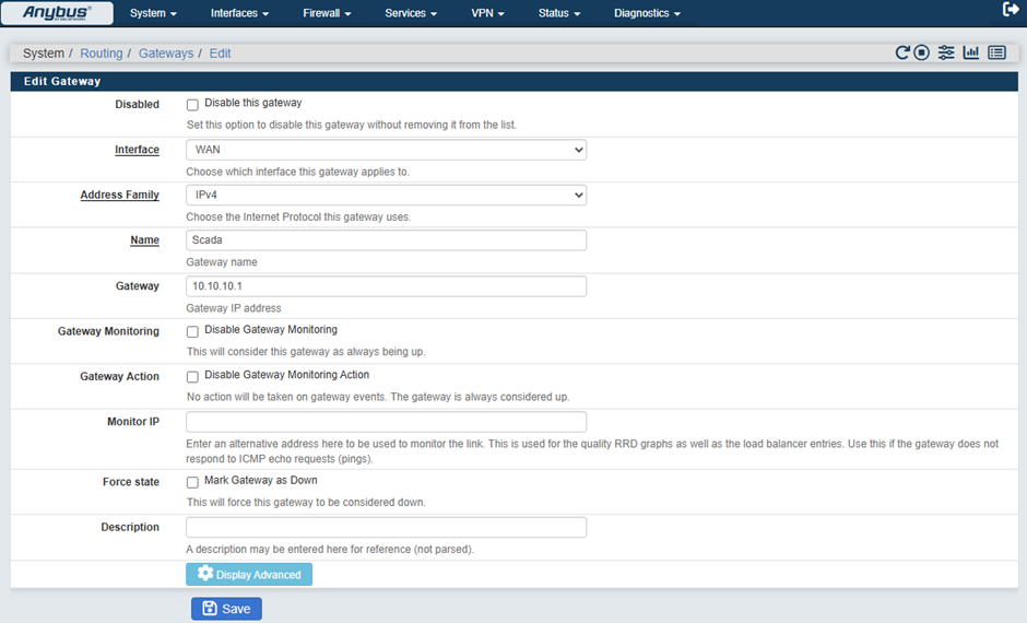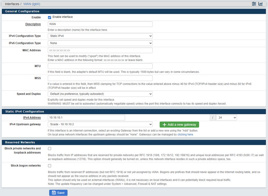 On the WAN Interface we change the IPv4 Upstream gateway to the Scada GW we just created.