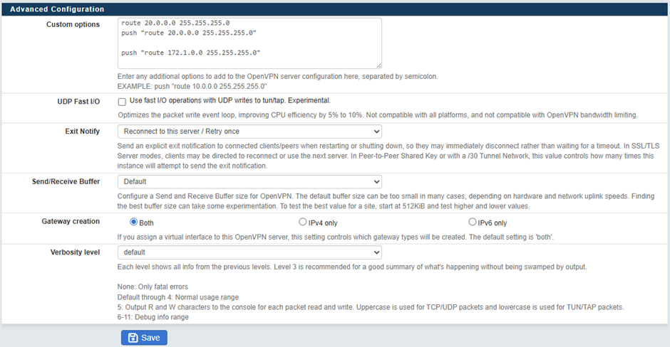 push "route 20.0.0.0 255.255.255.0"push "route 172.1.0.0 255.255.255.0"