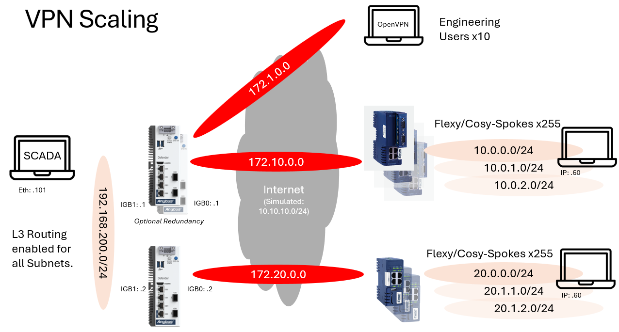 This use-case describes how to scale a private VPN setup. Flexy and or Cosy+ can connect as VPN Client with OpenSSL to Anybus Defender as a VPN server - however the Defender depending on model and traffic load can only handle a limited amount of Client. To scale up a second Defender can be deployed in parallel, and this use-case describes how to setup the routing so that all Spokes are reachable regardless what Defender you connect to as a use.