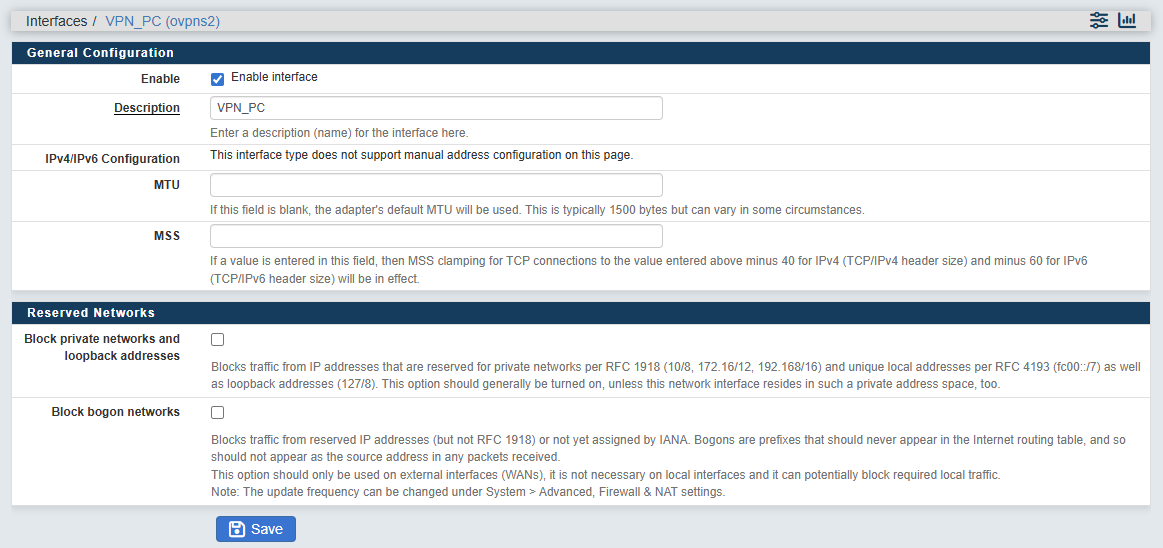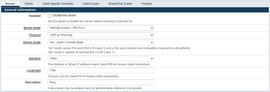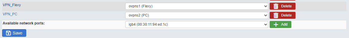 Make sure that the OpenVPN Servers have an Interface and are enabled. Check Interfaces -> Assignment and you should see this:If not click the dropdown menu besides "Available network ports" and select ovpns1 (Flexy) then +Add. Click the name of the newly added interface. In the new window you can enable the interface and in the Description box give it a name.