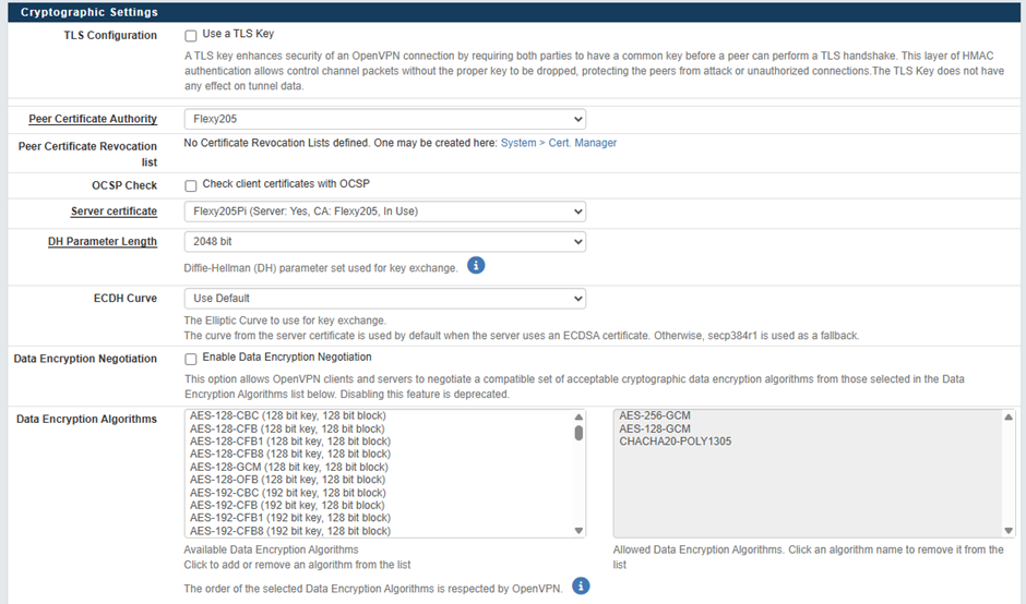 On this Defender we will setup a VPN servers for Flexy/Cosy-s to connect to. In this the server will use a unique IP subnet and interface and firewall rules.