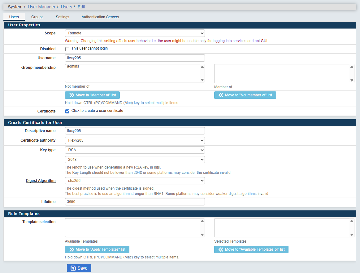 Choose Certificate authority: Flexy205 (the one created during the first wizzard)Save.