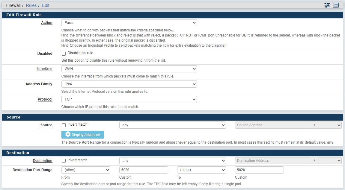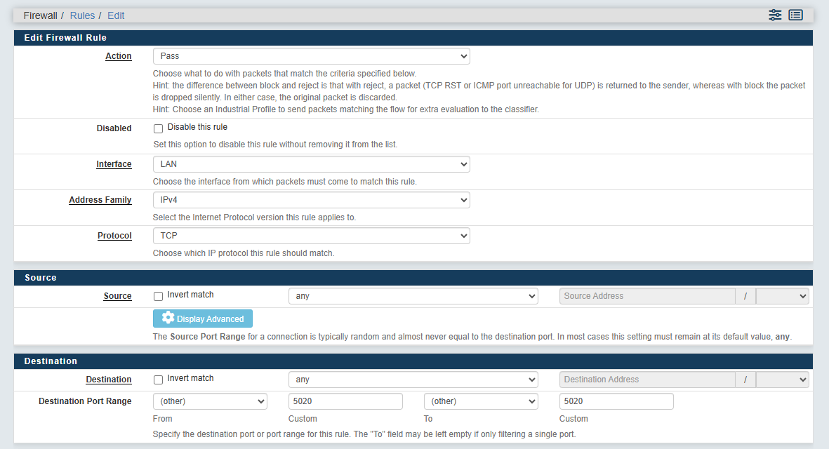 Here a rule for port 5020 has been added for SCADA to work, you can tighten security by adding the IP addresses.