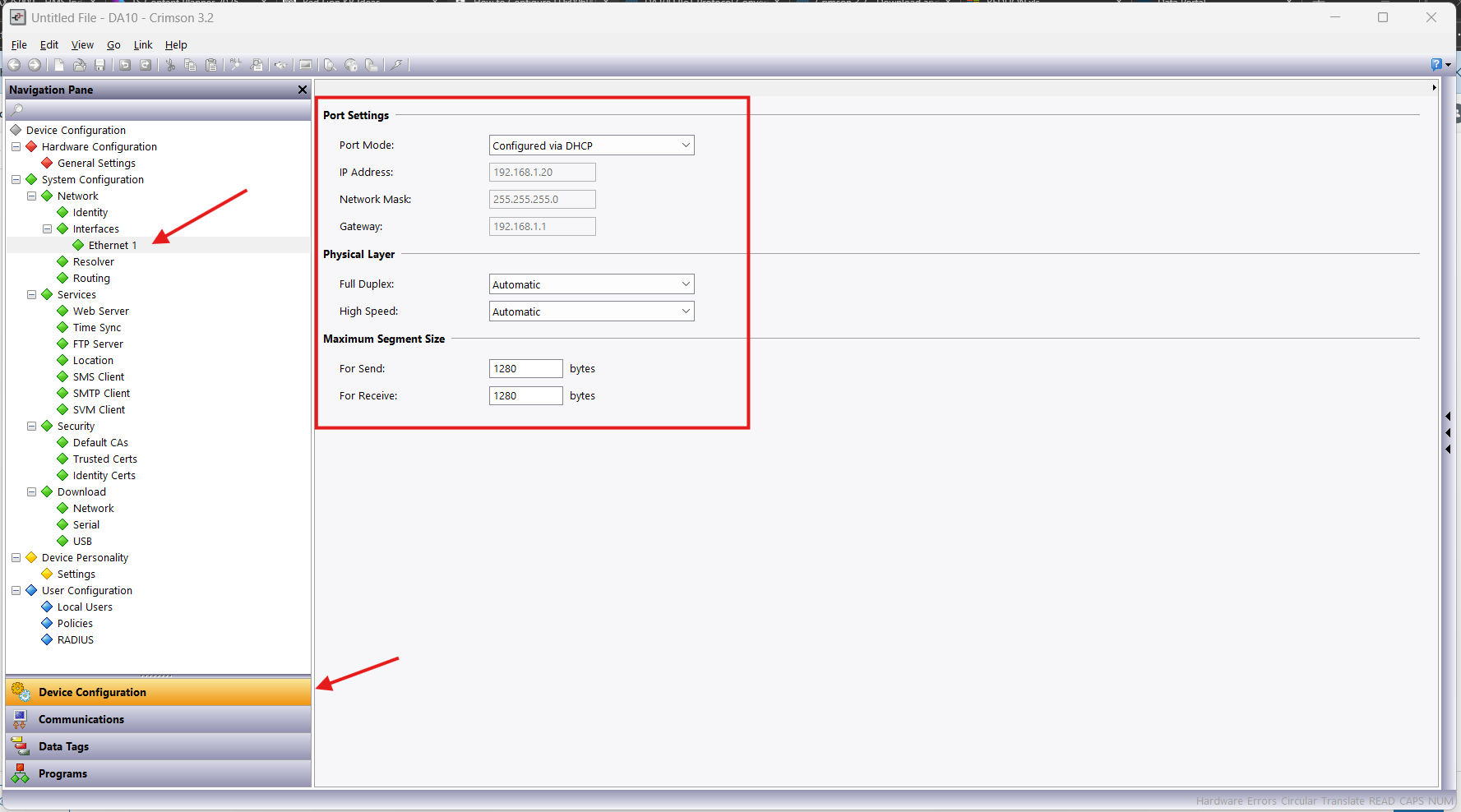 Note: Ethernet may not be available until you have downloaded the configuration to the DA10.