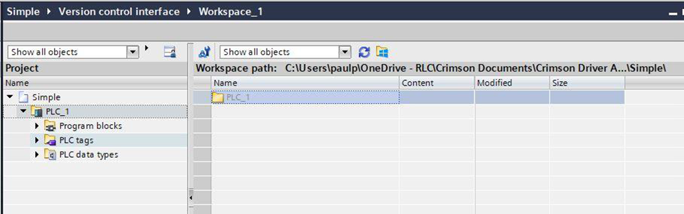 3. Drag required PLC items (Data Blocks, Tag Tables, Data Types) into the Workspace.