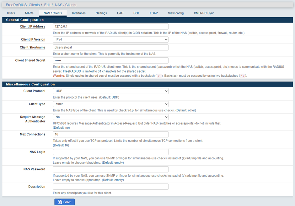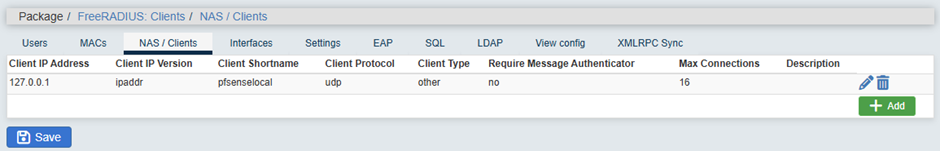 Services → FreeRADIUS → NAS/Clients → Add