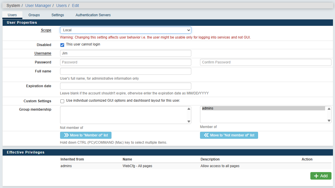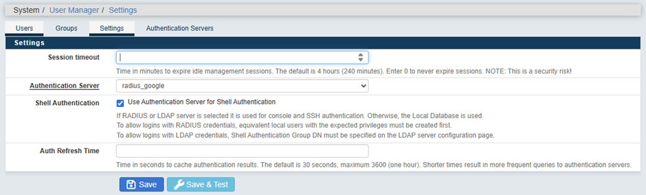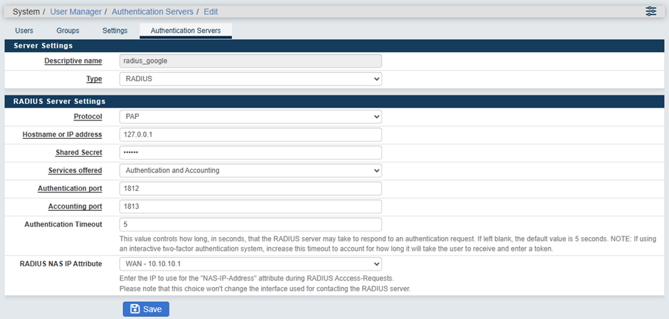 System → User Manager → Authentication Servers → Add