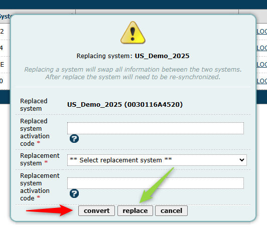 - Enter the Replacement Systems activation code.