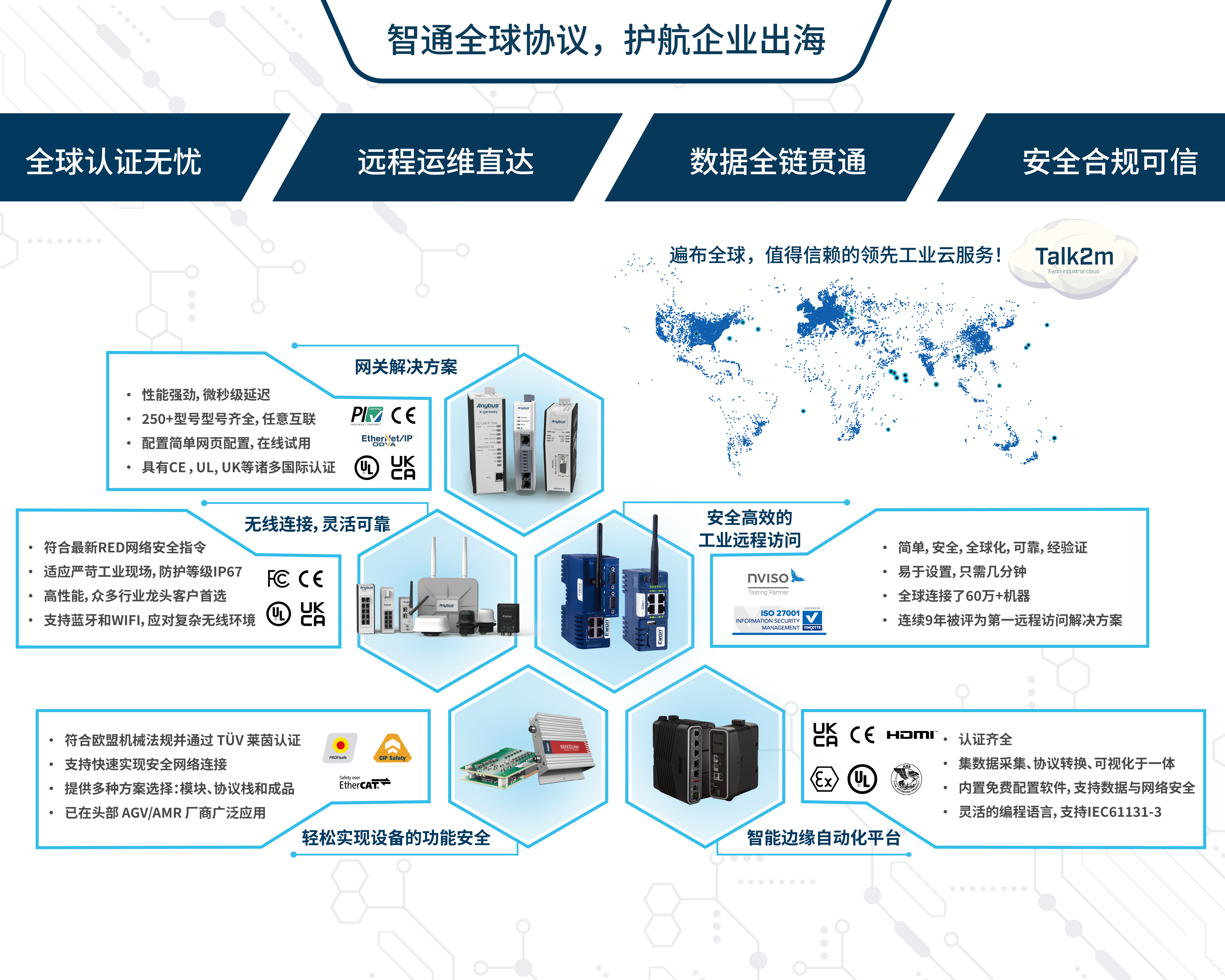 HMS 旗下产品涵盖从协议网关、工业远程解决方案、无线连接、功能安全到智能边缘自动化平台的多款产品,致力于为出海企业提供全链解决方案。